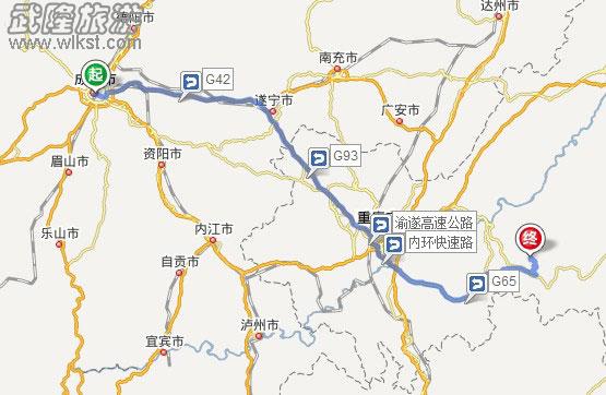 5、沿G93/成渝環(huán)線高速一直向前行駛183.2公里,從出口離開,朝南川/G65方向,進入包茂高速/渝湘高速/G65;(此路段收費139元)