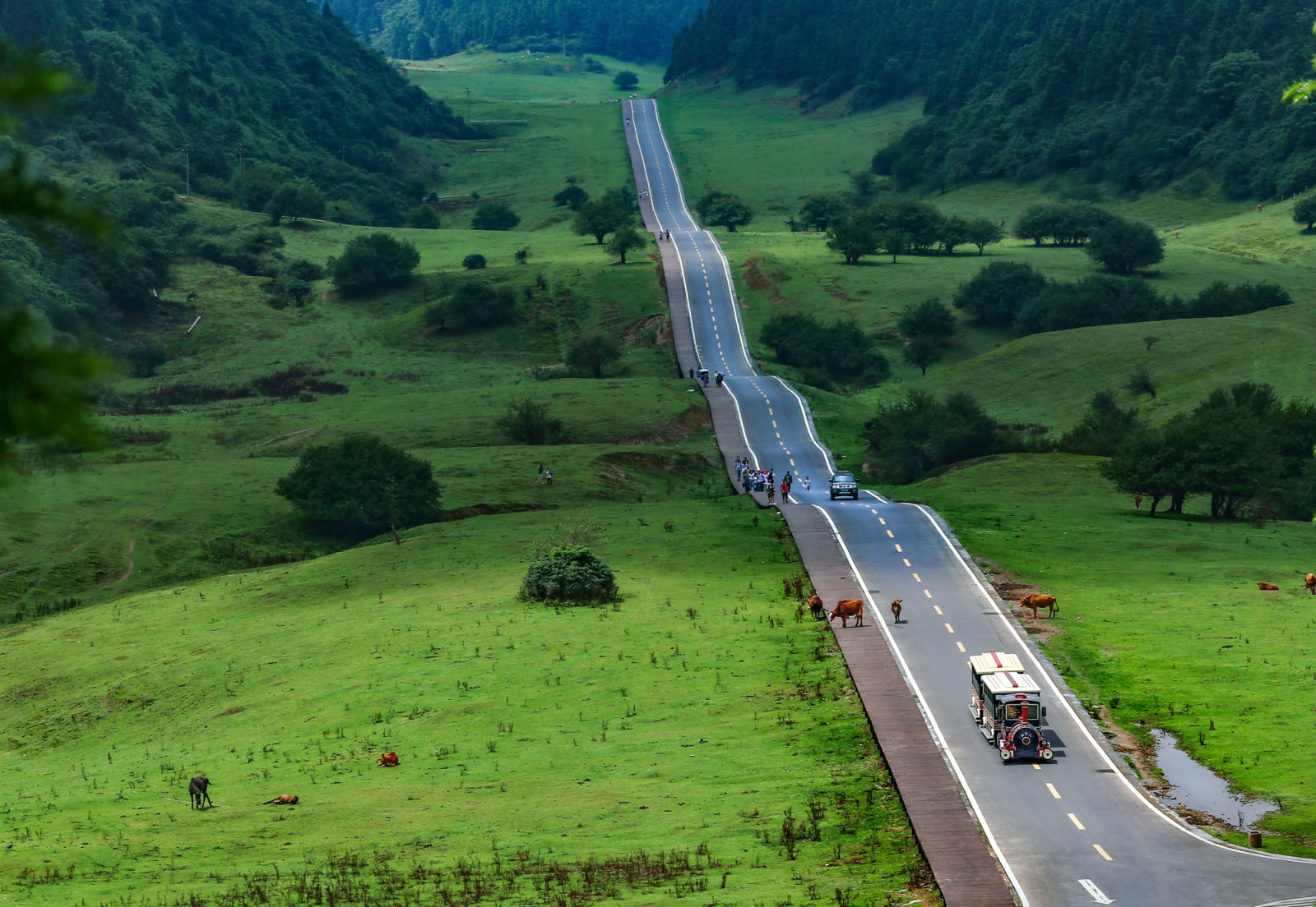 這是重慶公認的最美觀光公路,是通向仙女山大草原的景觀大道,公路高低起伏,草原如綠毯綿延向遠方,駕車飛馳,真正體驗一回“人在畫中游、車在景中走”是什么感覺。