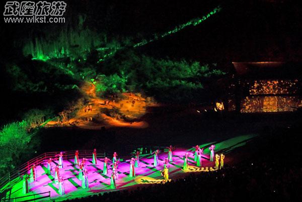 吃完晚飯后,可乘車前往印象武隆劇場(chǎng)觀看晚上8點(diǎn)30分的印象武隆大型實(shí)景演出。 印象武隆由著名導(dǎo)演張藝謀、王潮歌、樊躍共同打造的大型實(shí)景演出,該演出充分結(jié)合武隆喀斯特世界自然遺產(chǎn)資源和地方特色文化,以自然山水為舞臺(tái)背景,以群眾生產(chǎn)生活、民風(fēng)民俗、歷史人文和美麗傳說為藝術(shù)素材,帶給觀眾以文化為線、山水為伴的視聽享受和心靈體驗(yàn)。