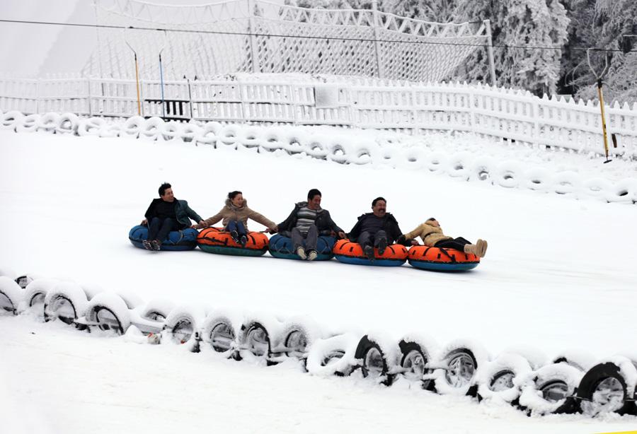 仙女山主要的滑雪項(xiàng)目時(shí)滑雪橇、雪上飛碟、滑雪船