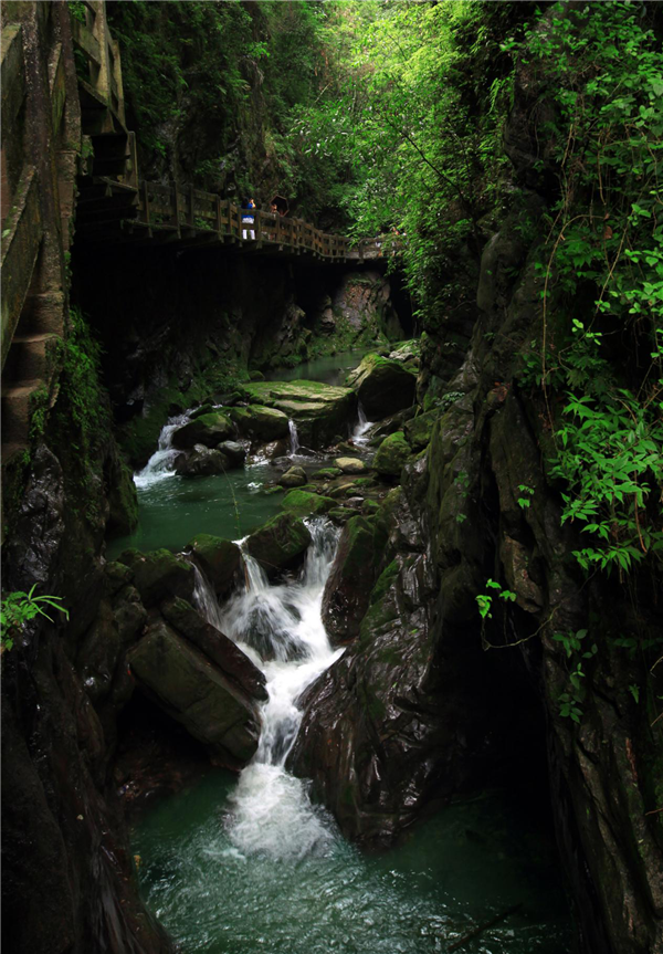 龍水峽地縫位于白果鎮(zhèn),是一座典型的喀斯特巖溶峽谷,和天生三橋一樣,乘坐80米的高空游覽電梯下至谷底,漫步谷底,猶如置身時空隧道,只見溪水潺潺,碧潭幽深。地下水從200多米的崖壁飛流至谷底,撞擊在谷底石壁上,站在谷底,呼吸著負氧離子極高的空氣,聽著流水聲,美妙!如果把天生三橋比作大家閨秀,那把龍水峽地縫比作小家碧玉一點不為過。