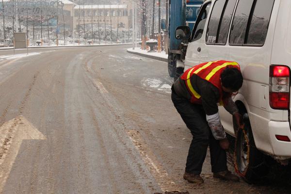 進入上山的盤山公路大約20分鐘過后,公路旁邊已經(jīng)可以看到一片雪白,遠處的群山上,已經(jīng)能看到不錯的雪景。這時候我們把車停了下來,在旁邊武隆旅游喀斯特公司的工作人員幫助下把防滑鏈裝上,真正踏上了仙女山南國學(xué)原之路。