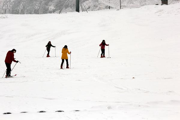 來到長松酒店旁的滑雪場,幾個大大的蒙古包上已經(jīng)墊起了很厚的白雪,印著天空淡淡的藍色,讓我們在冰冷的天氣里感到了一股連綿的溫暖。 四周都是游客,目測有估計一千人,在這大大的雪場,也還是顯得有一絲熙熙攘攘的感覺。不過人多不是更好么?下車后,我們在滑雪場的工作人員協(xié)助下套上了專用的滑雪工具,亦步亦趨的走向雪地??粗渌慰褪炀毜幕﹦幼?,矯健的身軀,我們羨慕嫉妒恨啊。我和小歐一只手扶著滑雪杖,一手互相牽著,可就是這樣還是一下子就摔倒了,在小靜他們不停笑聲當(dāng)中,像個鴨子一樣尋找著快樂。平哥們呢則是選擇了驚險刺激的“雪上飛碟”,從遠處不停的尖叫聲中,我輕易就能分辨出他們的頻率,因為他們在KTV的時候也最喜歡飚高音,而且相當(dāng)不錯喲。在一次瘋玩過后,到了中午飯點,我們按捺住仍不盡興的心情,就在長松酒店的餐廳解決掉饑腸轆轆的肚子。菜肴相當(dāng)?shù)呢S富,有很多當(dāng)?shù)氐耐撂禺a(chǎn),苕粉呀,蕨根啊,渣海椒炒土豆啊,還有野豬肉。一大桌子菜,讓我們恢復(fù)了不少的精力。用餐過后,收拾行裝繼續(xù)上路。