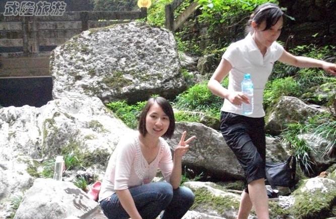 周五一早,太陽剛剛露出來,我們塞得滿滿的一車人就朝著武隆出發(fā)了。大約開了兩個小時就到了武隆縣城,一看路標,離仙女山景區(qū)還有27公里??梢蛔呱先ツ抢锏穆凡虐l(fā)現(xiàn)車開起有多累,完全是山路十八彎,一直在那兒走盤山公路,轉得人頭都暈了。又開了接近一小時吧,終于到了天坑和地縫的旅游接待處。在那兒我們就必須下車了,只能坐景區(qū)的車進去。到了景區(qū),太陽已是火辣辣的照著大地了,幾位男士就去買了幾頂草帽戴上,我們就準備打傘。景區(qū)安排的路線是游客去到谷底慢慢體味大自然的神奇,我們先就一直在下坡。走了很長一段路后,還要坐一截電梯下去,然后又走長長的下坡路,走得我們腳都有些發(fā)軟。不過一看到武隆那獨特的喀期特地貌時,大家都驚喜的呼叫起來。真的是太美了,而且四周的石壁陡得不得了,人徒手是完全上不去的。雖然太陽依然很烈,但走到坑底就完全不覺得熱了,反而有一絲涼意。我們一群人一邊玩一邊走,別人一個半小時就逛完的兩坑三橋,我們卻用了三個多小時,直到下午三點半才爬出了坑底,大家全都累得不得了,而且又餓!一出景區(qū)就發(fā)現(xiàn)一農家樂,馬上直奔那里。等了良久,菜終于端上來了,大家就狼吞虎咽起來,那些菜真好吃!。