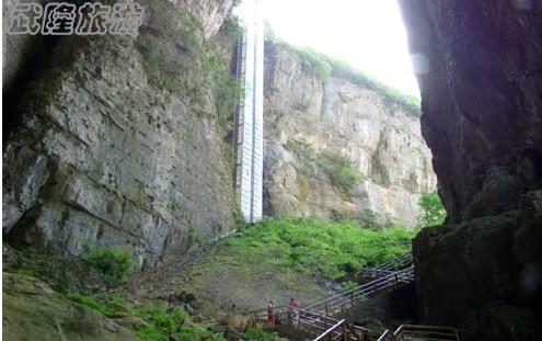 進入景區(qū)后順山道只拐一個小彎即來到通向天坑的電梯,這是一座緊貼懸崖建造的升降梯,下了電梯后再向下不遠就是曲折下行的石棧道。順棧道緩步而下,景區(qū)內(nèi)的壯觀景象逐漸顯露出來。