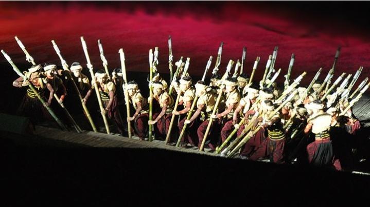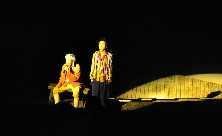 在三聲鐘響后,一片寂靜中,江水奔騰聲與川江號(hào)子聲悄然交替而起。一束強(qiáng)光打破夜的黑暗,舞臺(tái)中央“祖孫倆”將川江號(hào)子了千年歷史娓娓道來。