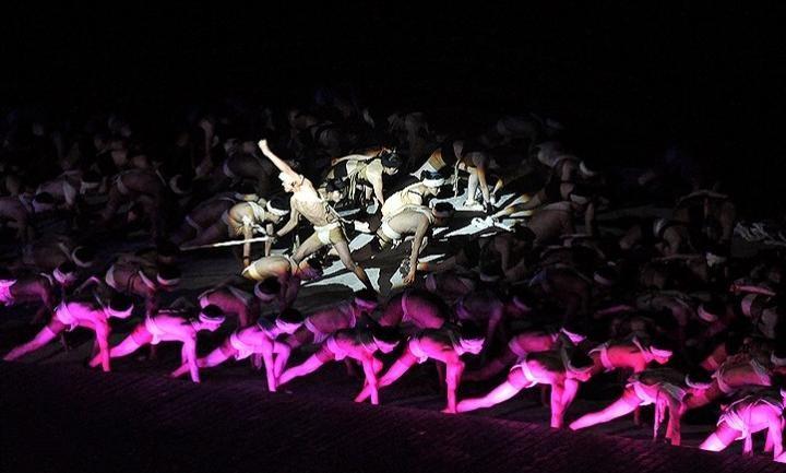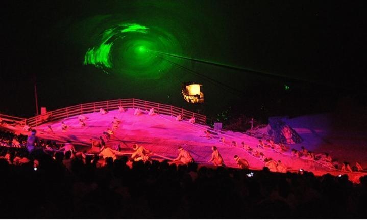 震撼力的節(jié)目應(yīng)該是那個(gè)纖夫拉纖的節(jié)目了“車車、閃閃、繩子、和短褲”就是纖夫拉纖時(shí)身上所有的物件。拉纖是不能穿衣服的,江上情況千變?nèi)f化,江水一會(huì)兒平一會(huì)兒兇,有時(shí)候一個(gè)大浪打過來,濕了衣服,把身子裹得緊緊地,用不上力,還會(huì)被江水卷進(jìn)去,那就沒命了。”老漢平實(shí)的講說充滿了畫面感,我仿佛看見了老漢帶著一群人,和憤怒的江水搏斗,江面上激蕩著雄渾有力的川江號(hào)子。而現(xiàn)場(chǎng)的舞蹈則把這一情景表現(xiàn)得淋漓盡致。