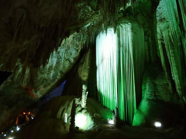 第二天早上我們?cè)缭绲木推饋?lái)了,前往芙蓉洞游玩。芙蓉洞是我們這次去仙女山旅游景點(diǎn)之一,它位于重慶武隆縣江口鎮(zhèn)芙蓉江入口處.芙蓉江是烏江的一大支流,放眼望去,江水碧綠,山青翠.它仿佛是一條淺綠色的綢緞環(huán)繞在洞的周圍,更透出了大自然靈秀之美! 芙蓉洞是一個(gè)大型石灰?guī)r洞穴,生成年代約在60萬(wàn)年至100萬(wàn)年之間,初探結(jié)果,芙蓉洞主洞長(zhǎng)2700米,總面積3.7萬(wàn)平方米,其中“輝煌大廳”面積1.1萬(wàn)平方米,最為壯觀。洞中主要景點(diǎn)有金鑾寶殿、雷峰寶塔、玉柱擎天、玉林瓊花、海底龍宮、巨幕飛瀑、石田珍珠、生殖神柱等。芙蓉洞內(nèi)鐘乳林立,種類繁多。所到之處光影變幻,更突出了洞內(nèi)景致的神奇。這些千姿百態(tài)的鐘乳石,或輝煌壯觀,或玲瓏剔透,其造型之豐富,可算芙蓉洞的第二奇。洞內(nèi)最讓人唏噓的是隨處可見的石柱群,這些高25米至30米的玉筍玉柱,潔白如玉,經(jīng)或紅或黃或綠的燈一射,單看如九天玉柱,群觀如仙山瓊閣,穿行其間,分明就成了桃谷仙人。洞中有一石瀑布,側(cè)看如瀑,正看如幕,高20余米,寬15米,折疊深度在1.5米以上,令人嘆為觀止。芙蓉洞里鎮(zhèn)洞之寶可算是命名為“瑤池雙塔”的水下方解石晶花,這個(gè)景點(diǎn)天然成一池,約30平方米,深約1米,池中的晶花形似珊瑚,色如玫瑰,呈帶狀層層分布水面,高低兩座鐘乳石筍,點(diǎn)綴在晶花之上,如兩座玉塔,有畫龍點(diǎn)睛之妙。難怪,芙蓉洞被堪稱為“中國(guó)最美麗的洞穴”、“天下第一洞”的神奇美譽(yù)!到此一游,果真名不虛傳,芙蓉洞真的是一座斑斕輝煌、內(nèi)容豐富的“地下藝術(shù)宮殿。”