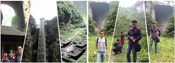 如果說我們第一天沒有體會(huì)到中國人國慶節(jié)的熱情,那么第二天我們便被這種熱情團(tuán)團(tuán)包圍。 早上8點(diǎn)驅(qū)車來到游客中心,昨晚空曠的廣場(chǎng)全部停滿了小轎車,我們被迫將車停在了路邊便沖進(jìn)游客中心買票。先把景點(diǎn)的票價(jià)向各位報(bào)告一下:天生三橋135,地縫115,仙女山60,芙蓉洞120,印象武隆238。這里非常感謝羅老師的兩本重慶游年票, 持年票本人免費(fèi),所帶的人可打9折。 本隊(duì)成員6人有老年證購半票,4人因年票也相當(dāng)于享受了4.5折票。(這小便宜占得)排隊(duì)1小時(shí)后購到票,坐景區(qū)觀光車5分鐘不到(該觀光車費(fèi)40元 ) 送我們到天生三橋的入口,景區(qū)為了疏散游客,分別把游客送到天坑的兩個(gè)入口,一邊入口是電梯,而另一邊是石梯。我們沒的選直接送到了石梯邊,一路向下走了半小時(shí)才下到坑底。