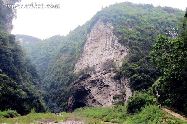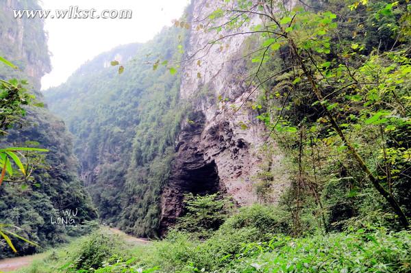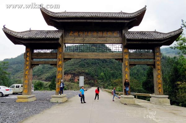 遠(yuǎn)處就是過(guò)來(lái)的大洞橋,橋頭立了一個(gè)大洞河旅游的木牌樓,很好辨別。左側(cè)邊就是供停車用的壩子。