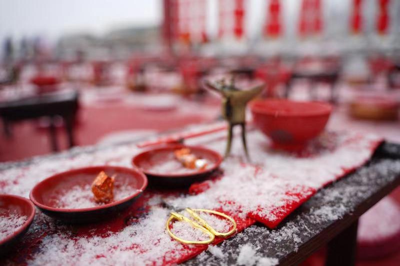 除了美景美女,21日當(dāng)天還見(jiàn)證了99對(duì)情侶的雪地婚禮。零下3℃的雪中集體婚禮一定是一輩子都忘不掉的美好回憶。這些情人來(lái)自全國(guó)30多個(gè)省市、港澳臺(tái)地區(qū),還有部分外籍友人。他們身穿大紅色漢服,完整地體驗(yàn)了一把中國(guó)傳統(tǒng)婚禮。