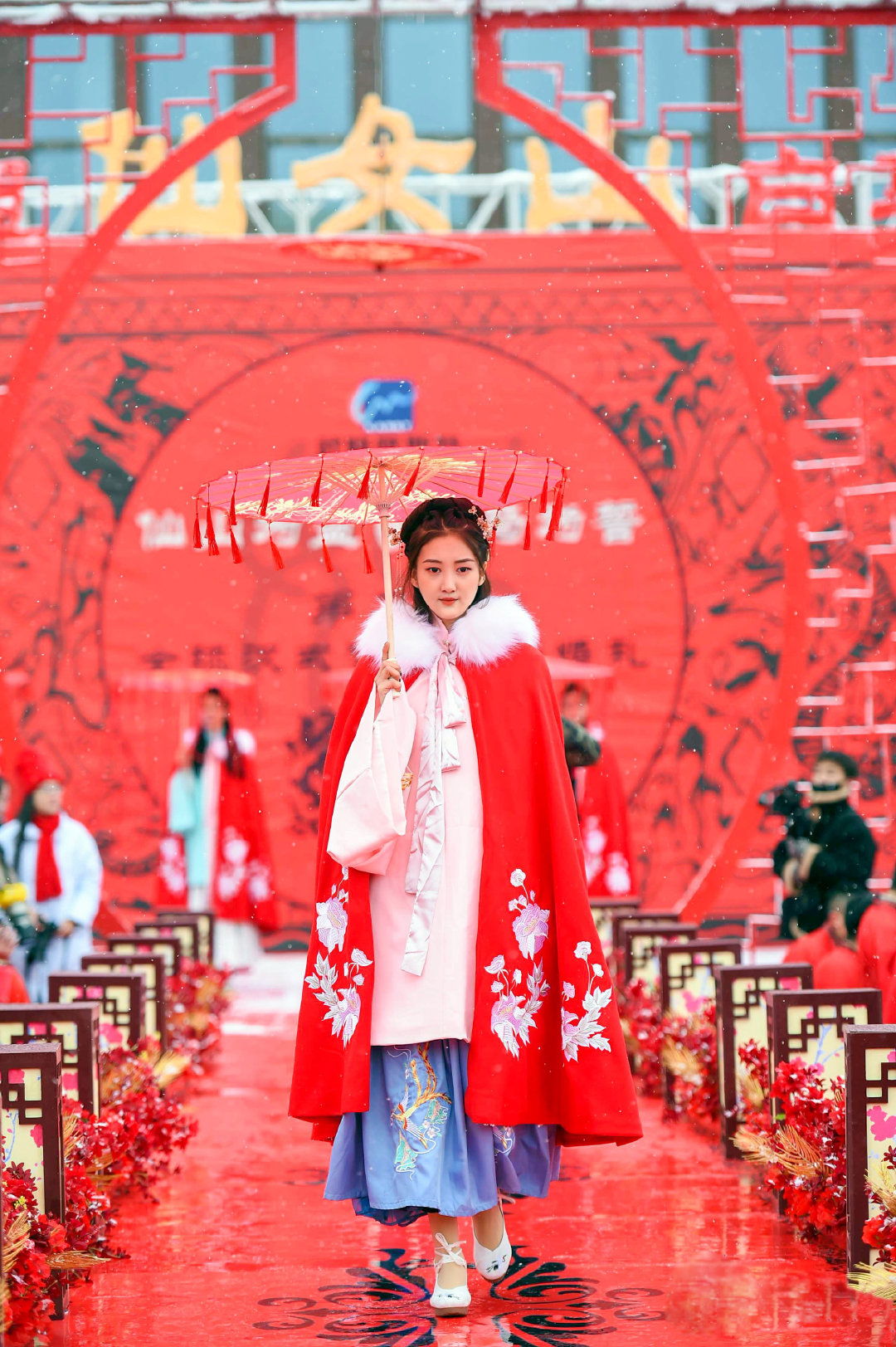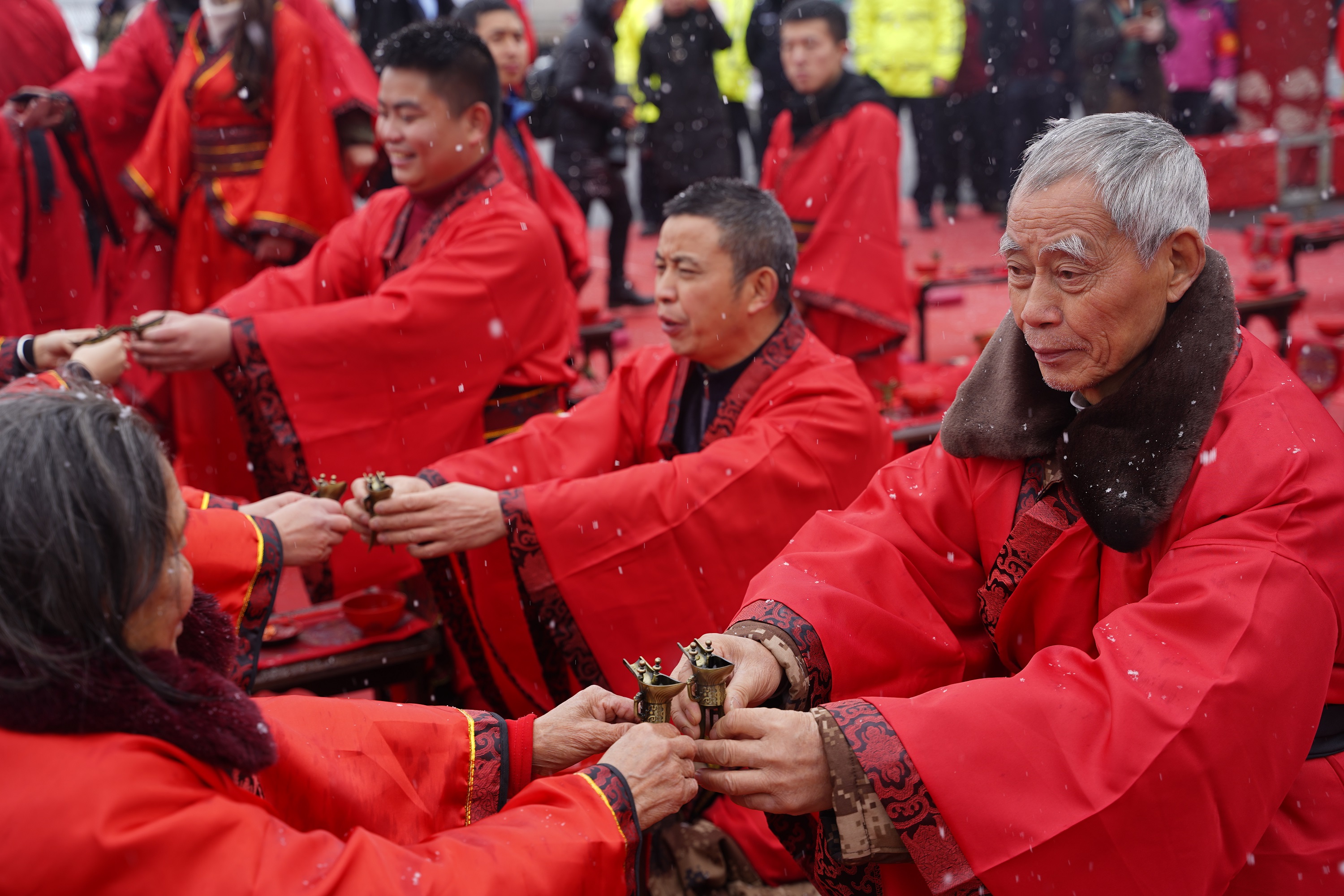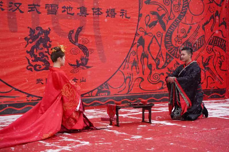 武小仙隆小馬作見(jiàn)證,99對(duì)新人舉行漢式雪地集體婚禮
