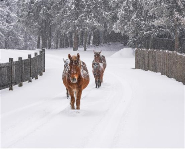 仙女山的雪,有北國的豪邁,也有南國的柔情。草原與山巒相接的雪景,美翻了這個季節(jié)的每個角落,鋪滿白雪的草原,盡展千里的蒼茫。雪花飛舞于山巒、林間,馬兒在雪中悠然行走,仿佛一張張?zhí)烊凰?,美不勝收?/p>