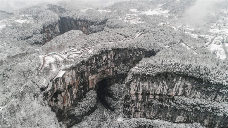 29日,世界自然遺產(chǎn)地天生三橋景區(qū)提前換上了節(jié)日的盛裝,漫山的積雪格外靚麗。漫天的雪花清爽、松散,猶如一顆顆瑩亮的晶粒,在樹林間追逐,在山石間跳舞,山崖間晶瑩剔透的冰掛和冰瀑讓整個(gè)景區(qū)被裝飾得更加圣潔、清新、幽深,而又富有韻味。橫空凌駕于峽谷之上的三座石橋被白雪冰封,宛如一條條飛天的白龍,讓原本壯觀的天生三橋平添了幾分神秘的色彩。