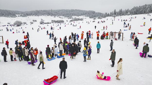 在滑雪橇區(qū)域,一個個滑雪愛好者一邊挪動著腳步,一邊用雪杖做支撐,感受俯沖而下的暢快刺激;在雪上飛碟區(qū)域,同伴們相互拉緊雪圈繩共同俯沖滑下,刺激的尖叫聲不絕于耳;兒童滑雪船區(qū)域,孩子們堆雪人打雪仗,到處充滿著歡聲笑語。
