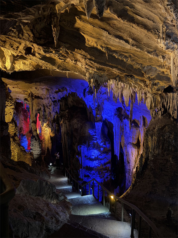 次日從“地下藝術(shù)宮殿”芙蓉洞啟程。洞內(nèi)鐘乳石琳瑯,在燈光映照下,“巨幕飛瀑”“生命之源”等景觀如幻似真,演繹地球億萬(wàn)年記憶。