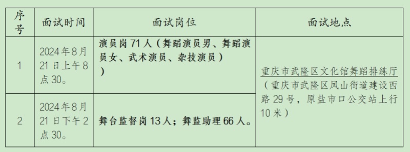 根據(jù)《重慶武隆旅游產(chǎn)業(yè)(集團(tuán))公司補(bǔ)充公開招聘<我在·武隆>演職人員公告》(以下簡稱:公告),現(xiàn)將面試相關(guān)事宜通知如下: