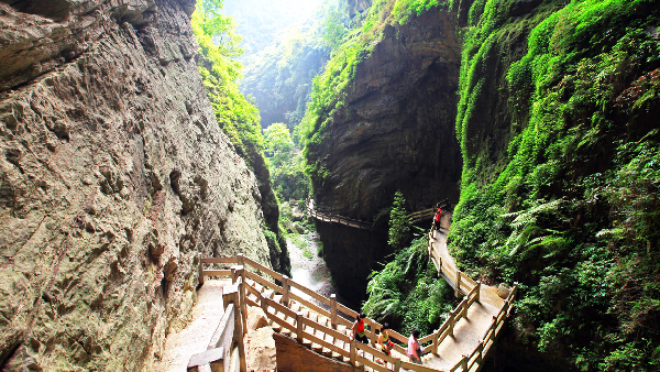 龍水峽地縫是幾千萬(wàn)年前造山運(yùn)動(dòng)而形成的地質(zhì)奇觀,峽谷長(zhǎng)約2.5公里,最深處達(dá)500米,以壁陡峽深、瀑布飛瀉、棧道險(xiǎn)峻著稱,被譽(yù)為“地球的裂縫”。