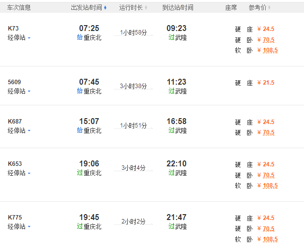 重慶北站火車站(重慶南站火車站改造中)-武隆火車站(票價為24.5元),每天差不多有10幾趟車。