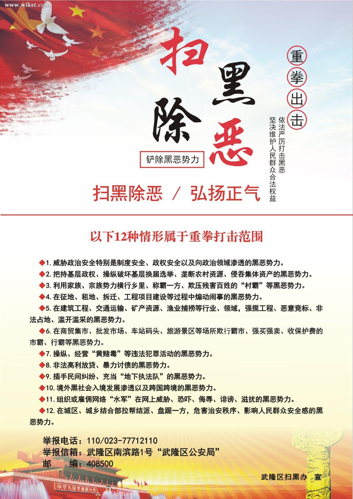 武隆區(qū)掃黑除惡舉報(bào)方式:舉報(bào)信箱:重慶市武隆區(qū)巷口鎮(zhèn)南濱路1號(hào)“武隆區(qū)公安局”(郵編408800);舉報(bào)電話:023-110;023-77712110;023-77824586;