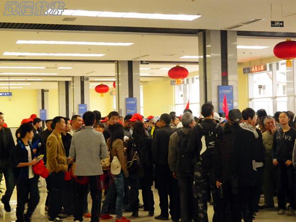 (武隆旅游網(wǎng)訊)繼昨日客流第一波高峰后,武隆游客數(shù)量今日再次劇增。記者在仙女鎮(zhèn)游客接待中心看到,從早上7:30開始,售票大廳變得熙熙攘攘,大量游客開始購票,已購好門票的游客則排隊乘坐景區(qū)中轉(zhuǎn)車。