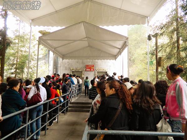 記者搭乘景區(qū)中轉(zhuǎn)車,跟隨游客到了天生三橋景區(qū)。由于游客很多,觀光電梯運量有限,天生三橋景區(qū)增開了一個入口。