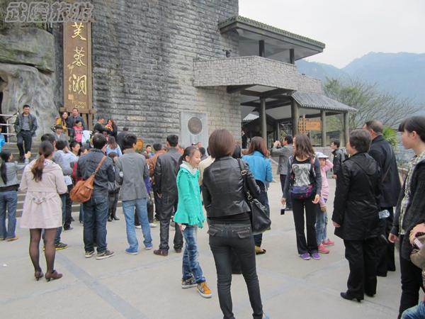 今天武隆天氣不如昨天的陽光明媚,多云的天氣微微帶點(diǎn)春日的寒意,但并沒有阻止游客游玩的熱情,記者今日前往的是位于武隆江口鎮(zhèn)4千米處的烏江和芙蓉江匯合處的芙蓉洞景區(qū),此時(shí)從全國(guó)各地而來大批的游客已經(jīng)在芙蓉洞前拍起了照,由于芙蓉洞停車場(chǎng)容納不下眾多自駕車輛,只得暫要求自駕小車停在江口鎮(zhèn)備用停車場(chǎng)。景區(qū)周圍已經(jīng)換上巨幅的印象.武隆宣傳畫,據(jù)息4月份“印象武隆”將在天生三橋印象劇場(chǎng)正式公演,不少游客紛紛表示遺憾,此次小長(zhǎng)假不能一睹印象武隆的風(fēng)采。
