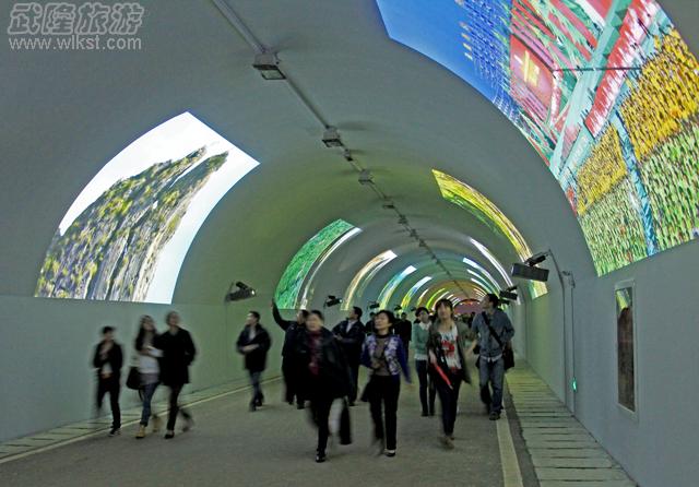 觀眾要進(jìn)入到“印象武隆”演出劇場,必須通過這條時空隧道,光是這條時空隧道就長達(dá)288米,屬人工挖掘行程,在近百臺投影儀照射下打造出夢幻光影效果,讓人感覺猶如在萬花筒中漫步穿越,于恍然不覺中抵達(dá)桃園大峽谷,在演出開始前便制造出了先聲奪人的獨(dú)特效果。