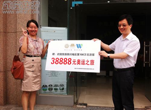 7月8日下午2點,據(jù)武隆景區(qū)數(shù)據(jù)統(tǒng)計,從2009年開始至今武隆旅游接待四川游客量突破100萬人,這標志著四川已經(jīng)成為武隆旅游核心的客源地。根據(jù)現(xiàn)場確認,這位第100萬名幸運兒是一位來自成都的王女士,在第1000家形象店開業(yè)典禮現(xiàn)場,武隆景區(qū)將價值3萬元的“倫敦奧運游”送給了王女士。