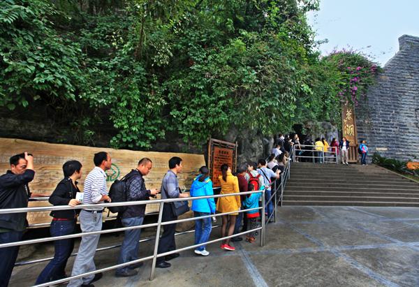 在芙蓉景區(qū)我們可以看到,在即將進入江口鎮(zhèn)就開始實行限時放行,大約每100米就有一位協(xié)警提醒自駕游客“依次通行,不要超車”,“一旦交通在江口鎮(zhèn)堵死,整個芙蓉洞景區(qū)的交通將癱瘓。”一位工作人員介紹說,由于芙蓉洞的停車場有限,所有自駕車進入江口鎮(zhèn)后將停在三個臨時停車場,然后再用景區(qū)大巴中轉(zhuǎn)車將游客運送到芙蓉洞入口處,三個停車場可容納近1500輛自駕車,每天早上8點開始停車場開始放行,到晚上8點所有車輛才基本全部離開停車場,整整12小時這里都在高速運轉(zhuǎn)。