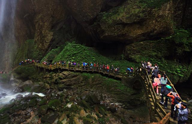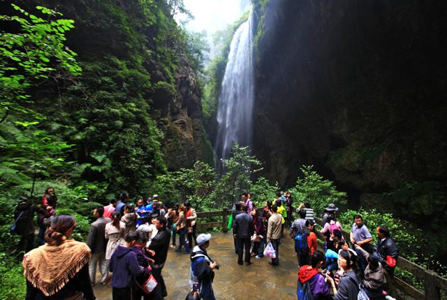 雨后放晴的龍水峽地縫瀑布水量大增,聲震峽谷,蔚為壯觀(guān);瀑布激起的水霧,隨風(fēng)浮游,游客好似身處紛飛的細(xì)雨之中;峽谷間懸浮的云霧,輕盈飄渺,把龍水峽地縫妝扮得格外美麗;景區(qū)深處,空谷清幽,植被盈盈翠色。在景區(qū)內(nèi)部一路前行,每跨一步,總有眾多游客紛紛合影留念,記錄下美好的瞬間,盡情享受回歸大自然的無(wú)窮樂(lè)趣。