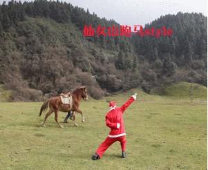 圖片中,可愛的網(wǎng)友身著圣誕紅裝,面對駿馬、仙女山特色小火車及卡丁車,效仿航母style中的經(jīng)典姿勢,給大家?guī)聿灰粯拥?ldquo;走你”。