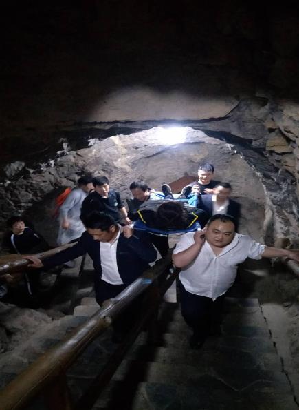 地縫景區(qū)在接到游客求助信息后,景區(qū)立即啟動(dòng)應(yīng)急救援預(yù)案,組織應(yīng)急救援小隊(duì)對(duì)游客展開救助。5分鐘后景區(qū)救援人員趕到現(xiàn)場,查看游客病情后,迅速?zèng)Q定用擔(dān)架的方式將游客抬出景區(qū)。在長達(dá)800米爬坡上坎的景區(qū)游道路途中,救援人員輪換著用肩扛、手抬等方式用時(shí)10分鐘時(shí)間,迅速將游客抬到景區(qū)進(jìn)口。大約休息10分鐘左右,游客感覺病情有所好轉(zhuǎn)。并在上車前,譚平的妹妹從包里拿出一疊鈔票飽含著淚水說道:“給大家買點(diǎn)水喝,辛苦大家了”,救援人員再三推辭,堅(jiān)決不收。