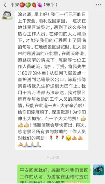 安全返回上海家中之后,6月25日,宋平再次通過(guò)微信向涂金川發(fā)來(lái)感謝,她表示,正是有了景區(qū)工作人員的熱心幫助,他們的旅行才能劃上圓滿的句號(hào)。接下來(lái),他們還將撰寫(xiě)感謝信,表達(dá)對(duì)所有參與救助人員的感激之情。