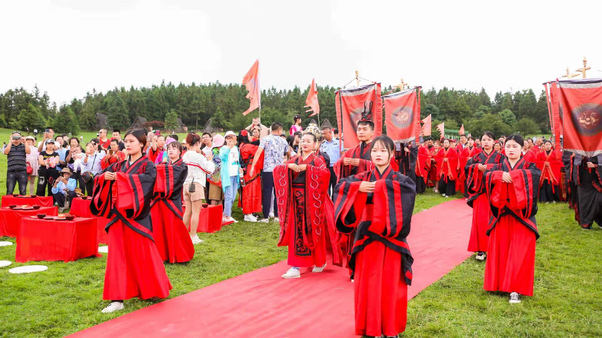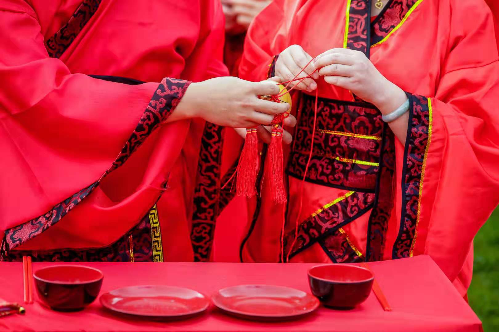 此次集體婚禮,以《周禮》為藍(lán)本,在《儀禮·仕婚禮》《禮記·昏義》所記載禮儀規(guī)制基礎(chǔ)上,結(jié)合了當(dāng)代審美進(jìn)行打造?;槎Y現(xiàn)場紅毯鋪地、紅綢覆案、漢旗飄揚(yáng),幾案上整齊地?cái)[放著漆碗、匏瓜等古典器具,原汁原味地再現(xiàn)了具有漢民族傳統(tǒng)特色的漢式婚禮儀式。