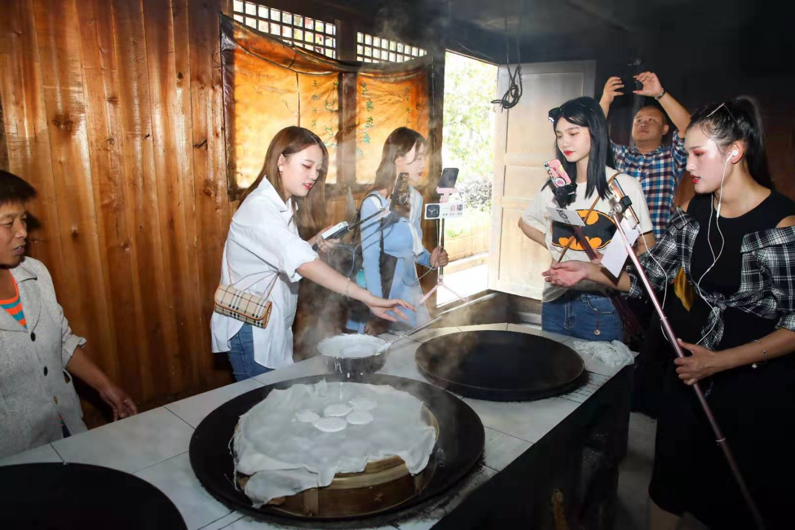 第一批進入村寨網(wǎng)紅主播正在進行傳統(tǒng)美食米粑制作直播