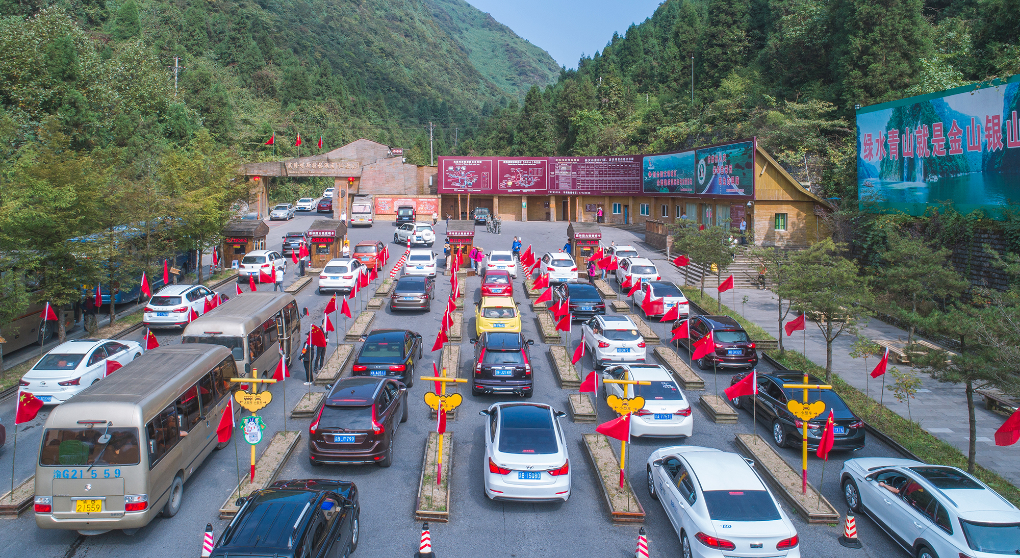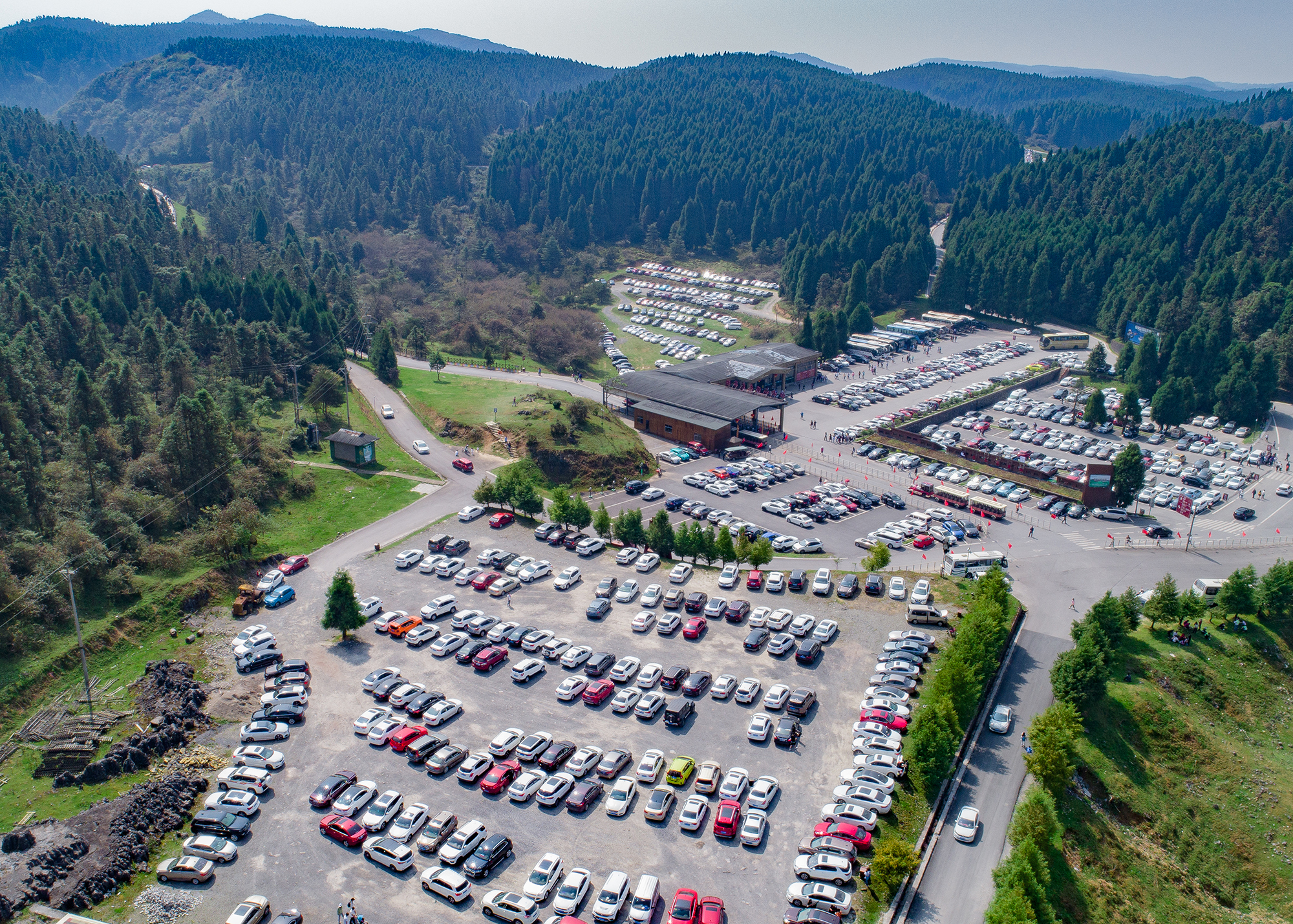 航拍仙女山游客接待中心,自駕車輛停放、行進(jìn)有序。