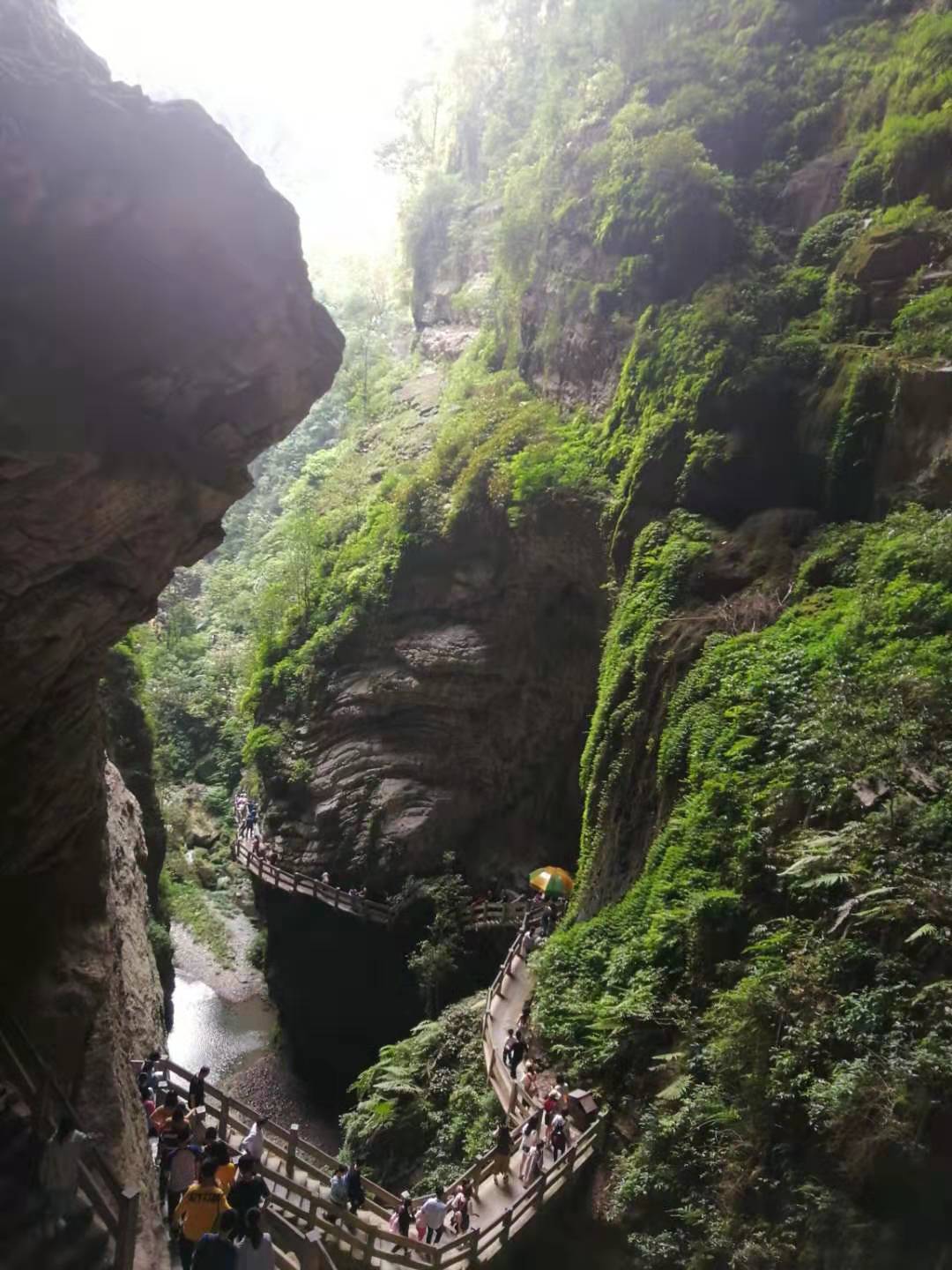 首先,穿過“龍水巖洞”,然后乘坐電梯垂直下降80米到達(dá)龍水峽地縫景區(qū)步行棧道,沿著一條又長又彎的階梯前行才能置身于谷底。