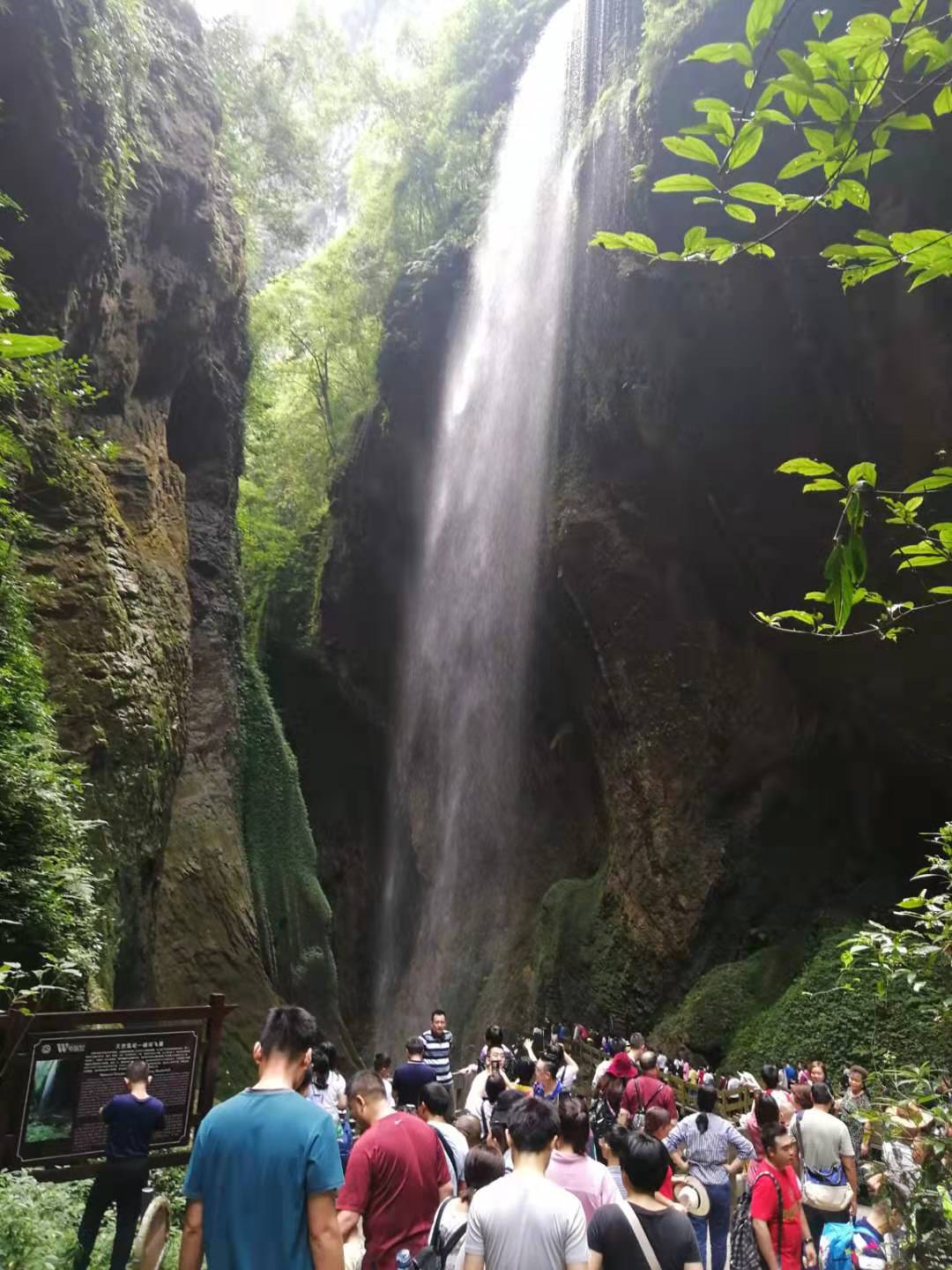 在棧道最深處,一股奔騰的瀑布直掛于百米高的懸崖上,瀑布直直地跌落了下去,白水一串連著一串飛流直下,像是一幅碩大的銀色幕簾。這處從峽谷右壁山洞中涌出的瀑布,沿著坡壁沖蝕之后,形成了幾處大小不等的深潭。據(jù)悉,瀑布終年流水不斷,妙哉,奇哉!一位來自廣東的女士向小編表示:“原來這就是傳說中龍水峽地縫景區(qū)的‘銀河飛瀑’啊,用李白的‘飛流直下三千尺,疑是銀河落九天’來形容這個(gè)瀑布也毫不夸張,難怪能夠吸引這么多游客前來打卡。”