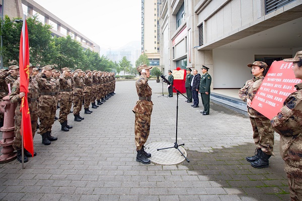 “我們的隊(duì)伍向太陽(yáng),腳踏著祖國(guó)的大地,背負(fù)著民族的希望,我們是一支不可戰(zhàn)勝的力量……”上午10點(diǎn)30分,在武隆喀斯特公司一樓廣場(chǎng),“仙女山女子民兵連”全體成員高唱《中國(guó)人民解放軍軍歌》,澎湃激昂、鏗鏘有力。隨后,區(qū)人武部政委馬宏偉宣布“仙女山女子民兵連”成立,并宣讀連排職干部任職命令。