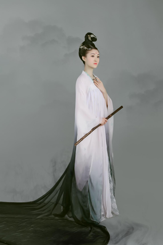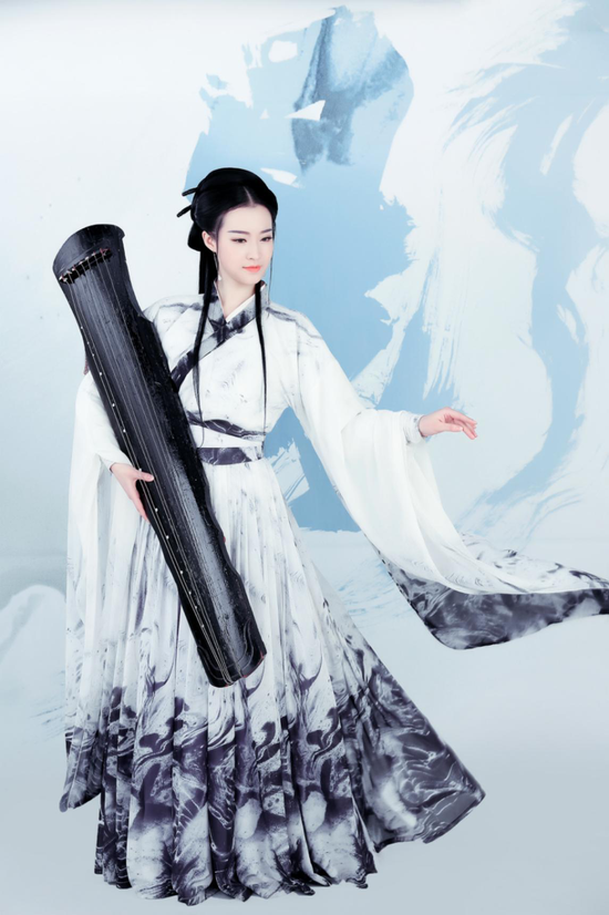 一位衣裳飄飄的唐代女子,在水墨丹青的山水畫里化身為磨,在天地間自由舞動。劉希貝的造型以水墨、書法形式來展現(xiàn)女子在畫中自由舞動的意境,造型圣潔,身姿搖曳,采用了素凈的背景,實現(xiàn)人物的整體立體感,線條美感。