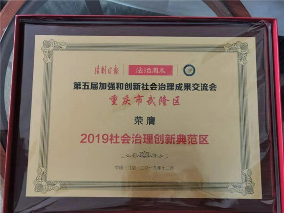 武隆區(qū)榮膺“2019社會(huì)治理創(chuàng)新典范區(qū)”榮譽(yù)。武隆區(qū)政法委供圖 華龍網(wǎng)發(fā)