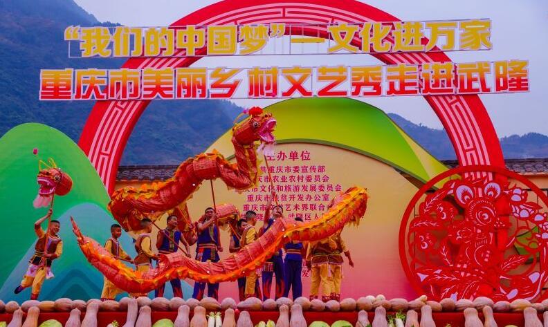 12月30日,“我們的中國(guó)夢(mèng)”——文化進(jìn)萬(wàn)家暨重慶市美麗鄉(xiāng)村文藝秀活動(dòng)在武隆羊角鎮(zhèn)政府廣場(chǎng)舉行。來(lái)自重慶市各大院團(tuán)的專(zhuān)業(yè)演員、市級(jí)、區(qū)級(jí)非遺傳承人來(lái)到現(xiàn)場(chǎng),為當(dāng)?shù)鼐用袼蜕狭艘坏镭S盛的文化大餐。