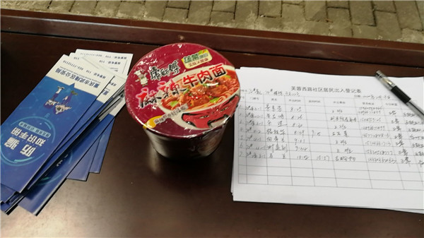 世紀(jì)廣場的鑫棧超市工作人員,看到志愿者早中晚都是面包+泡面+牛奶,看在眼里,十分心疼,主動為志愿者提供開水、桌凳等支援管控服務(wù)。