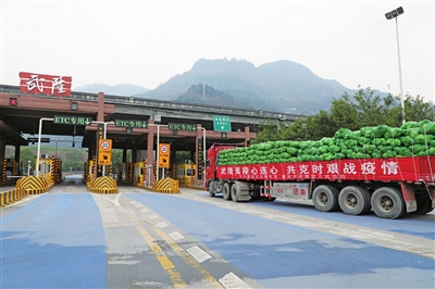 ?、?2020年2月13日,滿載50余噸新鮮蔬菜和肉類的三輛貨車帶著武隆人民的愛心,啟程前往湖北省宜昌市夷陵區(qū),以實際行動支援抗疫一線。