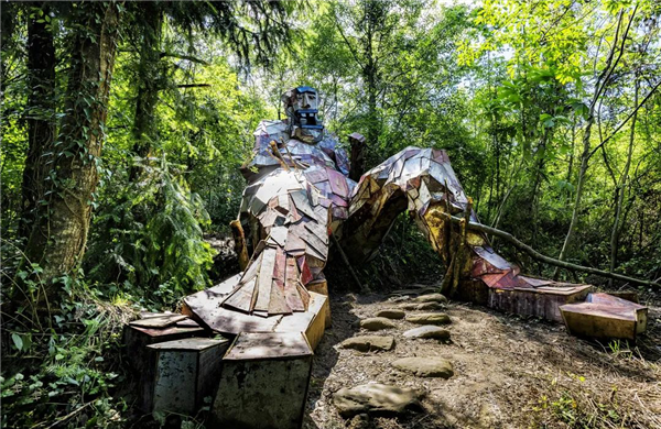 1979年出生的藝術(shù)家托馬斯·丹博,來自安徒生的故鄉(xiāng)丹麥,他是一位堅(jiān)持用廢舊物品做藝術(shù)創(chuàng)作的藝術(shù)家,來到武隆以后他特別愛這里的自然環(huán)境,不但用自己父母的名字給巨人命名,而且還給這個作品命名為《愛的小徑》。作品也是藝術(shù)家在呼吁我們,保護(hù)生態(tài),愛護(hù)環(huán)境,與大自然和諧共生。
