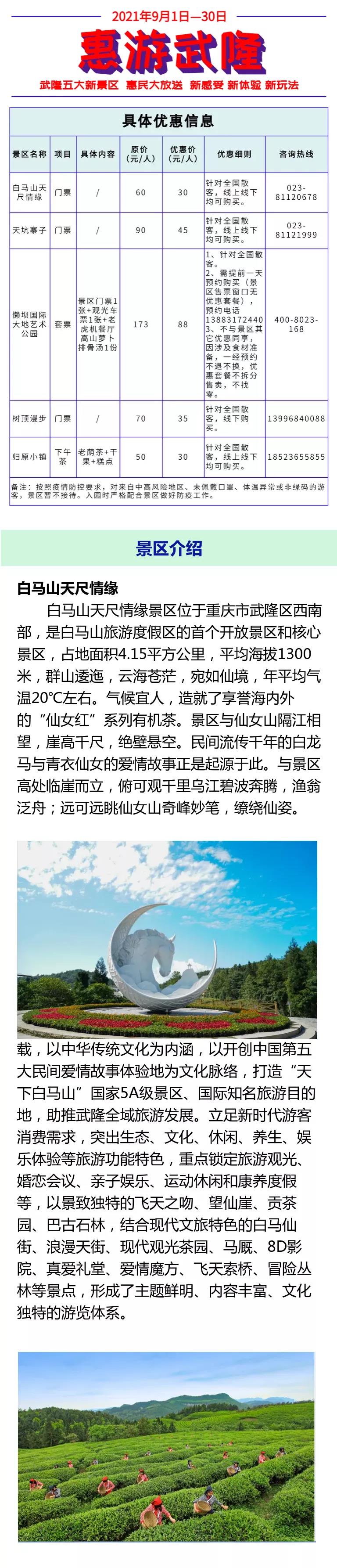 摘要: 9月1日到9月30日,武隆白馬山、天坑寨子、懶壩、樹頂漫步、歸原小鎮(zhèn)五大新品景區(qū)惠民大放送,新感受,新體驗,新玩法。