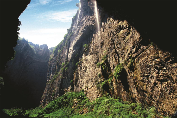 初秋的天生三橋綠意猶存,星星點(diǎn)的黃色、紅色讓原本宏偉壯觀的天生三橋增添了些許的溫柔。透過洞孔穿越空谷,你會覺得山連橋,橋連洞,洞連谷,像一群巨大的鏤空立體石雕。從石雕頂部的空隙處,你會看到遠(yuǎn)處的山巒云彩從外邊濃縮進(jìn)來。天空已收成一個不規(guī)則的油餅,亦可看成是一個哲人的臉譜??展乳g的崖壁、綠樹、清溪、驛站,撲入眼簾,令你應(yīng)接不暇。