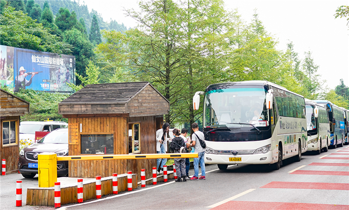 上午11點(diǎn),記者在仙女山國(guó)家森林公園入園處看到,排隊(duì)等候入園的車輛在3個(gè)檢票通道上排起了小長(zhǎng)龍。其中團(tuán)隊(duì)通道整齊排列的16輛旅游大巴尤為搶眼。景區(qū)工作人員對(duì)入園游客進(jìn)行掃碼、測(cè)體溫、查驗(yàn)健康碼和通行碼后方可進(jìn)入仙女山景區(qū)。