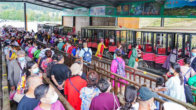 仙女山景區(qū)游客排隊(duì)有序乘坐觀光小火車